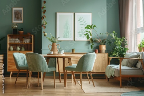 Modern Living Room with Scandinavian Mid-Century Design - Mint Chairs, Round Wooden Dining Table, Sofa, and Cabinet Against Green Wall.