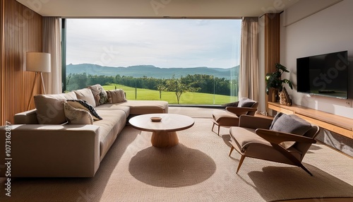 furniture, seat, room, chair, sofa, indoor, window, table, coffee table, family, luxury, cushion, contemporary, hotel, interior design, easy-chair, house, rug, minimalist, no one, home, lamp, curtain, apartment, wood, comfort, architecture, pillow, living room, modern, scenic view, armchair, natural light, cosy, home decor, relaxation, interior, view, living, glasses, floor, indoor, wooden, nobody, empty, design