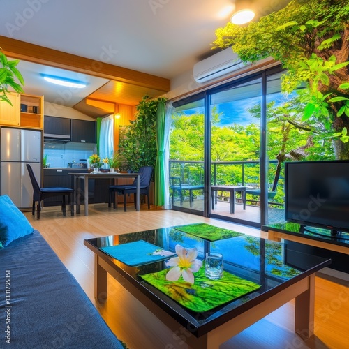 Modern Living Room with Scenic View and Vibrant Greenery