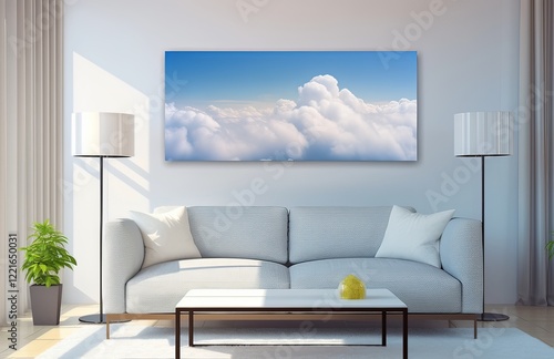 Modern Living Room with Sofa, Coffee Table, Floor Lamp, and Tranquil Painting of Blue Sky and Clouds, Natural Light Through Large Window