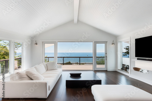 living, room, ocean, view, modern, interior, coastal, home, bright, space, white, sofa, hot drink, table, large, window, natural, light, design, contemporary, style, minimalist, decor, furnishing, scenic, relaxation, area, decorative, accent, hardwood, floor, deck, sliding, door, tranquil, atmosphere, comfort, family, sunlight, ambience, stylish, inviting, leisure, panoramic, elegant, peaceful