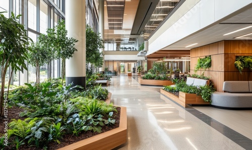modern, interior, lobby, atrium, plant, greenery, foliage, fern, wood, flooring, polished, concrete, seating, sofa, bench, natural, light, bright, window, glasses, architecture, design, contemporary, roomy, office, building, landscaping, vertical, wall