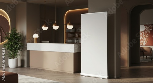 Modern lobby with a blank banner, stylish counter, potted plant, golden lamps, & arched details
