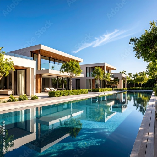 luxury, modern, home, pool, architecture, contemporary, estate, water, design, elegant, property, residential, building, landscaping, exterior, sunny, blue, sky, minimalist, roomy, tranquil