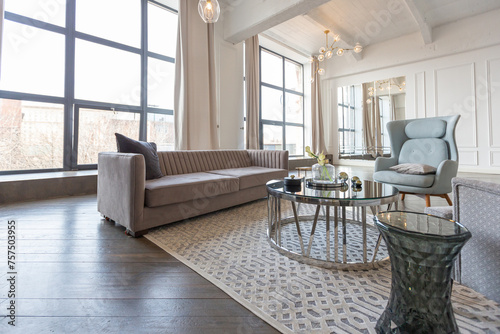 Modern luxury stylish apartment interior in pastel colors. a very bright room with huge windows filled with daylight. white walls, wooden parquet floors and a dark marble fireplace
