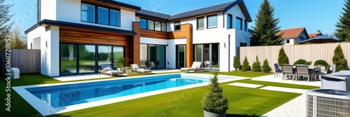Modern luxury villa, swimming pool, contemporary architecture, landscaped garden, large windows, wood accents, outdoor living space, sunny day, blue sky, tranquil setting, high-end real estate, panora