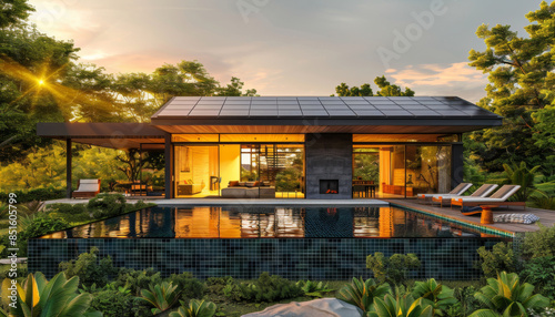 modern luxury villa with a swimming pool and garden on a tropical island. the house design is in wood, glass and metal materials. evening lighting with solar panels on the roof to provide energy