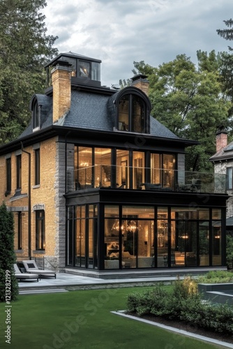 Modern mansion features glass facade and elegant design, blending luxury with natural surroundings in a tranquil estate during early evening