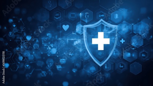 Modern Medical Shield with Cross on Blue Background Ideal for Digital Healthcare Marketing, Emphasizing Security and Trust.