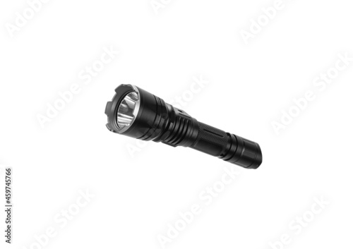 Modern metal LED flashlight in black color. Portable flashlight isolate on a white back