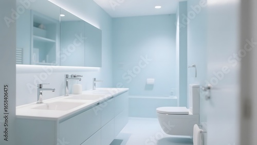 bathroom, minimalist, privies, mirror, light blue, contemporary, vanity, bathtub, interior design, roomy