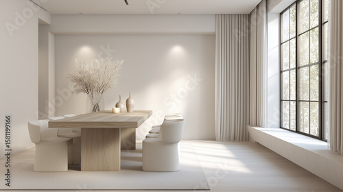 Modern minimalist dining room interior with elegant furniture, clean lines, and bright natural light, creating a stylish and cozy home atmosphere.