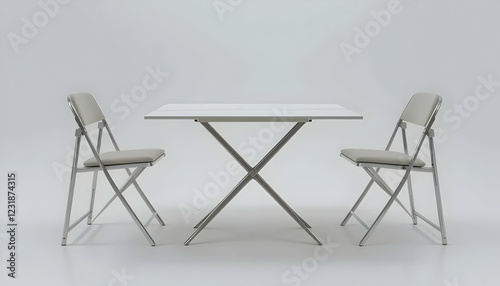 table, chair, folding, minimalist, modern, furniture, design, interior, home, decor, white, silver, metal, aluminium, contemporary, simple, elegant, compact, dining, kitchen, apartment, office, room, seating, comfortable, stylish, clean, light, bright, neutral, aesthetic, structure, frame, padded, seat, backrest, foldable, portable, easy, convenient, practical, functionality, efficiency, lifestyle, home decor, interior design