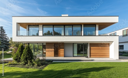 two-story, lawn, garden, clear sky, architecture, landscape, nature, sunny day, design, real estate, luxury, home, exterior, urban living, scenic view