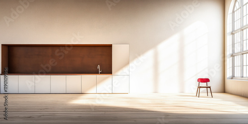 minimalist, interior, design, kitchen, roomy, natural, light, cabinetry, bright, space, red, chair, modern, contemporary, wooden, floor, window, stylish, tranquil, aesthetic, emptiness, clean, uncluttered, open, concept, seating, home, decor, sunlit, elegance, inviting, simplicity, informal, warm, tone, element, residential, room, arrangement, architectural, artful, calming, comfortable, functional, cosy, colours, chic