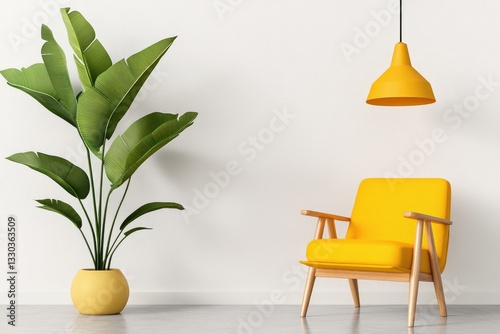Modern Minimalist Interior with Yellow Armchair and Lush Green Plant for Tranquil Living Spaces