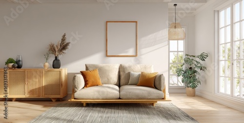 minimalist, living, room, modern, beige, light, wooden, furniture, sofa, rug, decor, art, frame, plant, natural, warm, cosy, bright, sunlight, empty, space, simple, clean, neutral, cabinet, vase, dried, grass, texture, design, home, interior, comfortable, stylish, window, sun, calm, peaceful, contemporary
