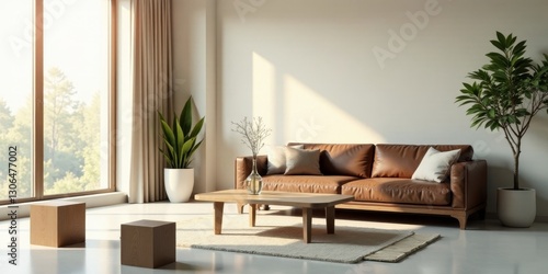 Modern minimalist living room design with brown leather sofa, wooden coffee table, and natural sunlight streaming through large window
