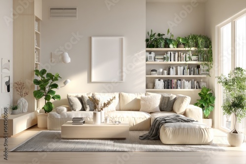 modern, minimalist, living, room, interior, beige, light, bright, natural, comfortable, roomy, cosy, sofa, sectional, hot drink, table, plant, shelving, book, art, frame, decor, design, home, warm, sunlight, contemporary, texture, wood, rug, cushion, pillow, accent, airy, clean, simple, stylish, elegant, neutral, calm, peaceful, relaxing