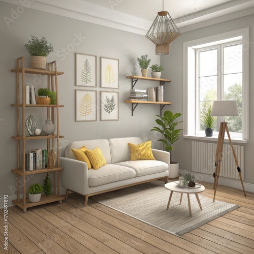 “Modern Minimalist Living Room Interior with Sofa, Plants, and Wooden Decor”