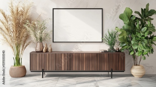 modern, minimalist, living, room, artwork, framed, wooden, cabinet, plant, decor, beige, neutral, sunlight, interior, design, display, empty, space, frame, natural, bohemian, dried, flower, vase, potted, marble, texture, stylish, simple, contemporary, calm, elegant, clean, light, warm, aesthetic, furniture, home, image, rendering, three-dimensional