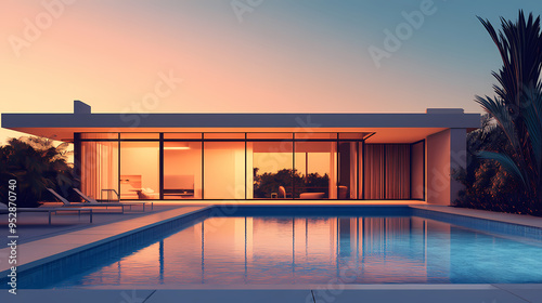 modern, minimalist, private, house, exterior, pool, evening, sunset, generated, ai, image, illustration