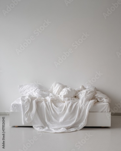 Modern Minimalist Unmade Bed with Crumpled White Sheets Premium Hospitality and Wellness Concept for Relaxation and Empty Space Marketing Content