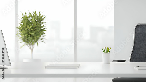 office, desk, workspace, modern, minimal, clean, white, minimalist, simple, interior, design, professional, workplace, contemporary, bright, plant, desktop, computer, tablet, technology, organised, neat, tidy, efficiency, productivity, corporate, business, stylish, elegant, calm, serene, peaceful, orderly, roomy, airy, window, light, sunlight, view, city, building, chair, table