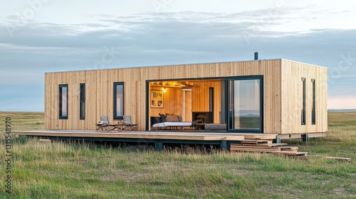 Modern minimalist wooden house with an extended deck, built entirely from sustainable materials