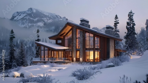cabin, mountain, winter, snow, forest, tree, modern, architecture, design, home, house, luxury, vacation, ski, chalet, cosy, fireplace, light, window, wooden, landscape, nature, scenic, beautiful, peaceful, quiet, serene, relaxing, get-away, escape, dream, real estate, property, exterior, frost, glacé, cold, icy, white, grey, blue, brown, evening, dusk, twilight, night, sunset, sunrise