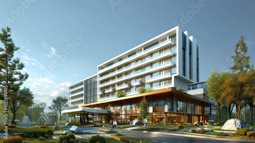 building, architecture, modern, hotel, apartment, complex, park, tree, landscape, exterior, design, facades, residential, commercial, multistorey, people, 2, asian, city, urban, contemporary, construction
