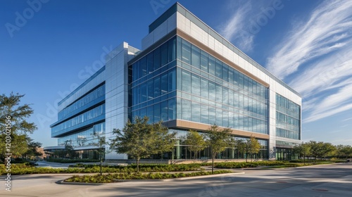 building, architecture, modern, office, glasses, window, facades, design, contemporary, structure, commercial, corporate, skyscraper, urban, exterior, landscape, tree, plant, landscaping, sky, cloud, sunlight, daytime, metal, concrete, development, property, real, estate, business, park, green, piazza, pathway, street, parking, lot, area, environment, shadow