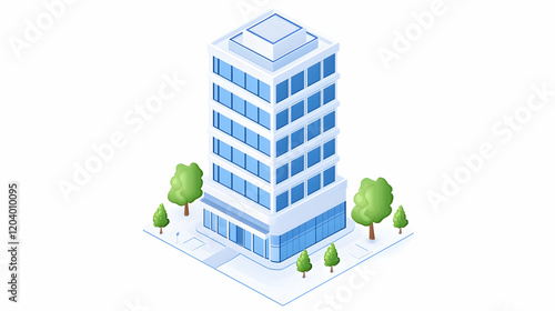 Modern office building, city view, isometric illustration, perfect for website design