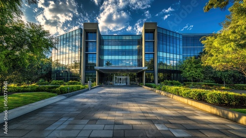 building, office, modern, exterior, facades, glasses, architecture, business, city, urban, commercial, structure, entrance, pathway, landscaping, tree, shrub, sunlight, cloud, sky, day, contemporary, design, professional, corporation, corporate, investment, property, real, estate, development, success, growth, financial, prosperity, global, workplace, elegant, sophisticated, path, ground, stone, concrete, daylight, innovation, technology
