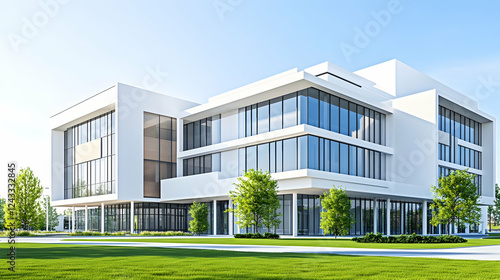 building, office, modern, architecture, exterior, business, city, commercial, contemporary, structure, urban, design, facades, glasses, sunny, day, landscape, green, tree, grass, park, outdoors, daylight, clean, white, front, city landscape, development, company