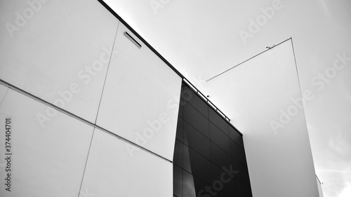 Modern office building wall made of steel and glass with blue sky. Black and white.