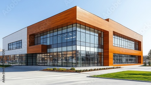 building, architecture, modern, office, commercial, business, exterior, facades, glasses, wood, paneling, contemporary, design, structure, construction, real estate, property, corporate, development, urban, sky, blue, sun, day, light, window, door, entrance, parking, lawn, grass, concrete, ground, street, driveway, new, clean, bright, professional, futuristic, style, luxury, innovative, functional, sustainable, highrise