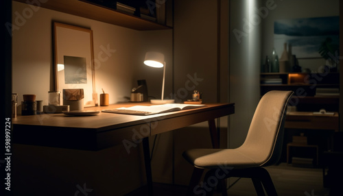 Modern office desk illuminated by electric lamp generative AI