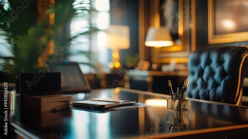 office, desk, interior, design, luxury, modern, chair, table, glasses, gold, black, room, work, business, executive, corporate, professional, workspace, elegant, furniture, style, decor, architecture, minimalism, classic, dark, detail, window, light, shadow, wood, leather, clean, sophisticated, simple, comfortable, organised, aesthetic, cleanliness