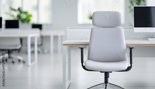 Modern office interior featuring a stylish, ergonomic chair surrounded by minimalistic furniture