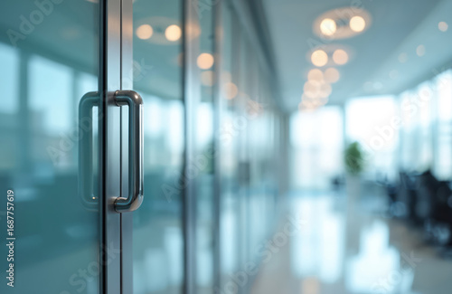 Modern office interior featuring glass doors, bright, clean hallway with blurred background. Sleek chrome handles, reflective surfaces convey contemporary business architecture, professional