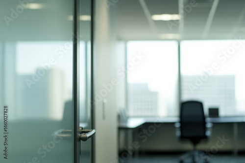 office, interior, modern, door, glasses, hallway, corridor, view, city, window, desk, chair, workspace, professional, contemporary, minimalist, empty, quiet, bright, light, neutral, calm, subtile, steel, handle, ceiling, frosted, corporate, business, professionalism, efficient, functional, organised, simple, clean, sleek, empty space, focused, productive, work, daytime, blurry, background