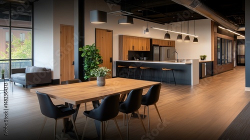 office, interior, workspace, modern, design, furniture, wood, lighting, kitchen, table, chair, decor, plant, minimalist, layout, contemporary, room, architecture, seating, retail, counter, wall, window, floor, professional, clean, stylish, corporate, fashion, environment, area, dining, casual attire, relaxing, functionality, usability, bright, natural light, urban, organisation, comfort, style, location, aesthetic, space, arrangement