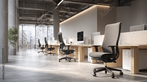 modern, office, space, ergonomic, natural, light, interior, workspace, chair, furniture, desk, empty, corporate, business, design, contemporary, architecture, workstation, nobody, indoor, workplace, professional, comfortable, open, plan, style, decor, grey, bright, window, plant, concrete, column, minimalist, clean, layout, desktop, computer, equipment