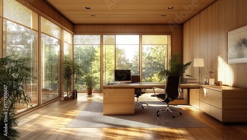office, desk, chair, window, wood, sunlight, blind, modern, interior, design, home, room, view, natural, minimalist, contemporary, style, elegant, roomy, comfortable, bright, warm, peaceful, professional, work, space, glasses, plant, carpet, floor