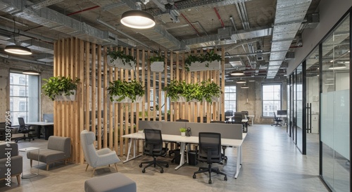 Modern open office space, industrial loft style, exposed ceiling, hanging plants, wooden slat features, gray and white color scheme, ergonomic office chairs