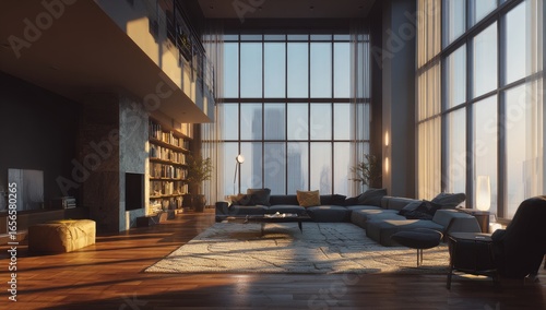 penthouse, living, room, modern, city, view, large, window, sunlight, roomy, interior, design, contemporary, furniture, sofa, hot drink, table, rug, wood, floor, bookshelf, fireplace, lighting, decor, urban, luxury, apartment, home, furnished, comfortable, cosy, elegant, minimalist, sleek, warm, calm, bright, stylish, sophisticated, high, ceiling, balcony, open, plan