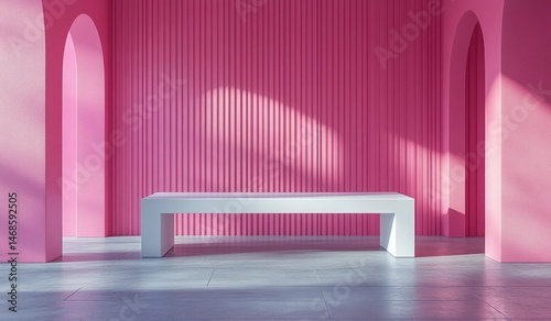 interior, pink, room, modern, design, white, bench, architecture, contemporary, wall, light, sunlight, shadow, concrete, floor, arch, empty, space, minimalist, simple, smooth, surface, geometric, line, texture, style, furniture, rendering, perspective, minimal, bright