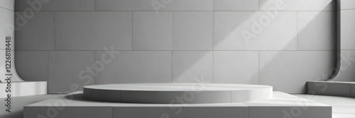 Modern podium constructed from folded gray concrete slabs with clean lines and a minimalist aesthetic, minimalist aesthetic, platform design
