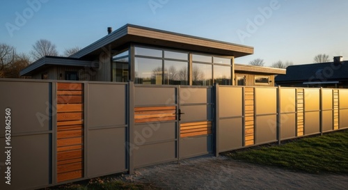 fence, modern, house, home, wood, grey, privacy, property, architecture, sun, residential, contemporary, building, security, design, sky, exterior, sunlight, panel, metal, garden, green, grass, construction, estate, backyard, structure, private, protective, barrier, wall, suburban, urban, daytime, bright, peaceful, elegant, neat, clean, new, exclusive, landscape, empty, nobody, clear, hard-wearing, ground, entrance